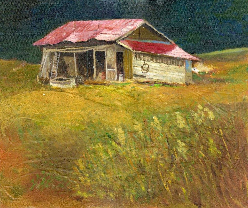 信州にリンゴ狩りに行った。 食べ頃のリンゴを楽しんだ後、山道を散歩していると山の斜面に小屋があった。 無人らしく半ば壊れた状態ながら如何にもまだまだ現役という小屋で雨上がりの屋根のトタンが雨を反射して赤い色が強烈だった。