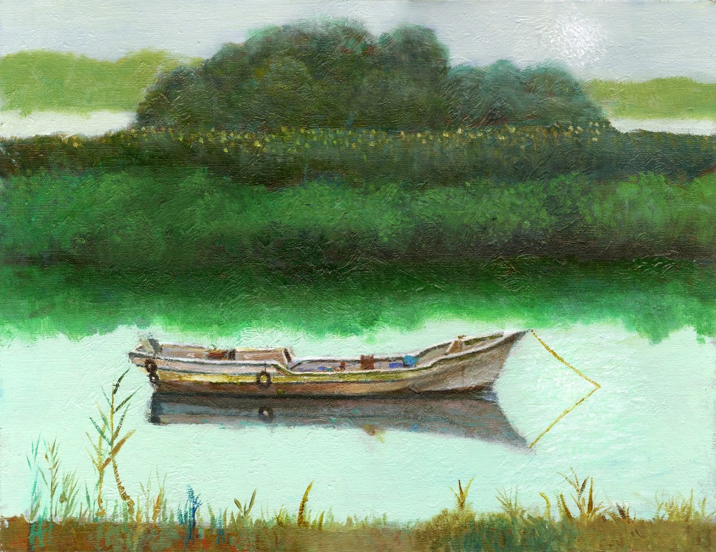 手前に土手の草がみえ、船の向こうに木曾川の土手、さらにその向こうに小さな林、その向こうが木曾川さらに木曾川の反対側の土手。
